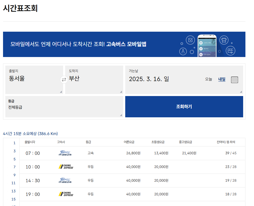 - 서울 → 부산: 부산행 고속버스는 하루에 여러 차례 운행되며, 소요 시간은 약 4시간 30분입니다.