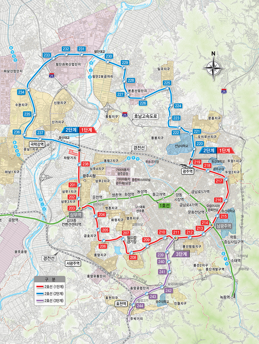 1단계(광주시청, 월드컵경기장, 백운광장, 광주역 등), 2구간(광주역, 전남대, 수완지구, 광주시청 등), 3구간(백운광장, 효천역 등)