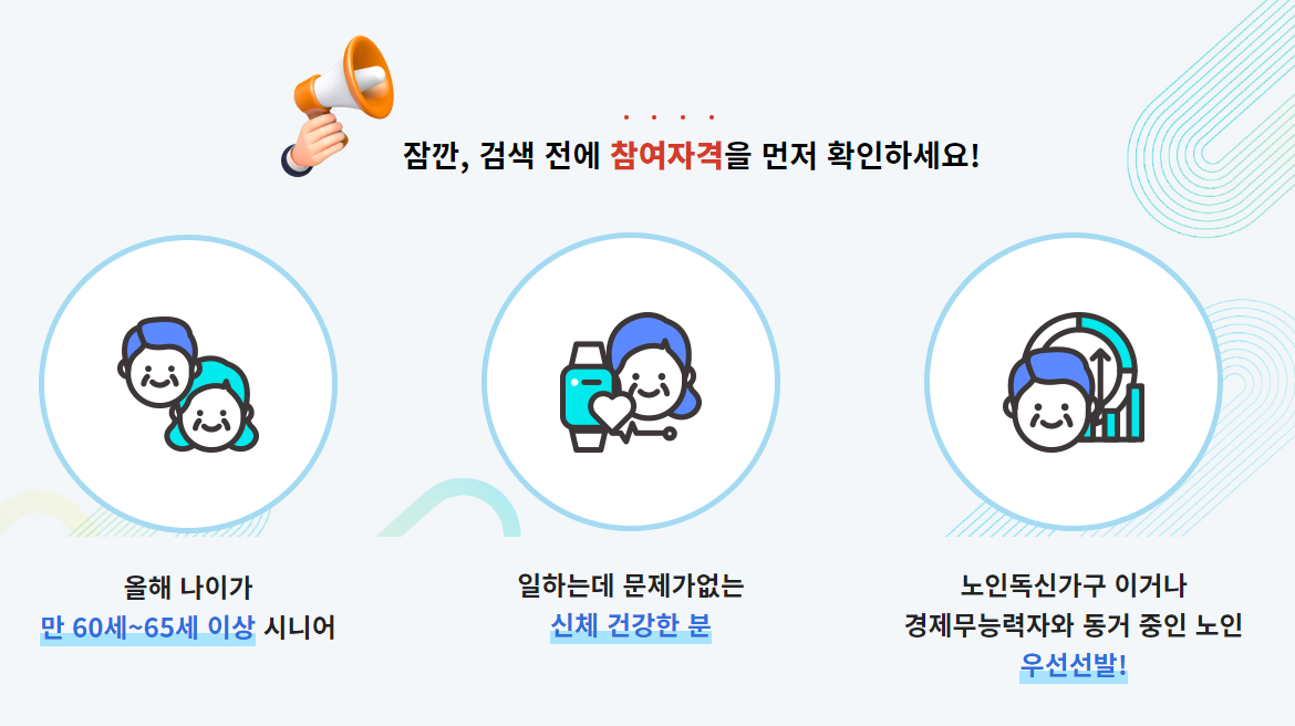 노인일자리 신청 자격은 기본적으로 만 60세 이상이며, 기초연금 수급자, 저소득층 노인, 독거노인 등 경제적으로 어려움을 겪고 있는 노인이 우선 대상이 됩니다.