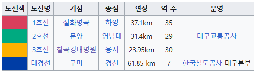 대구광역시의 지하철, 즉 대구 도시철도는 현재 1호선, 2호선, 3호선, 대경선을 대구교통공사와 한국철도공사 대구본부 두 양사가 공동으로 운영하고 있습니다.