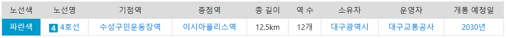 대구 지하철 4호선은 수성구민운동장부터 이시아폴리스까지 연결하는 노선으로 2026년 착공~3030년 개통을 목표로 추진 중에 있습니다.
