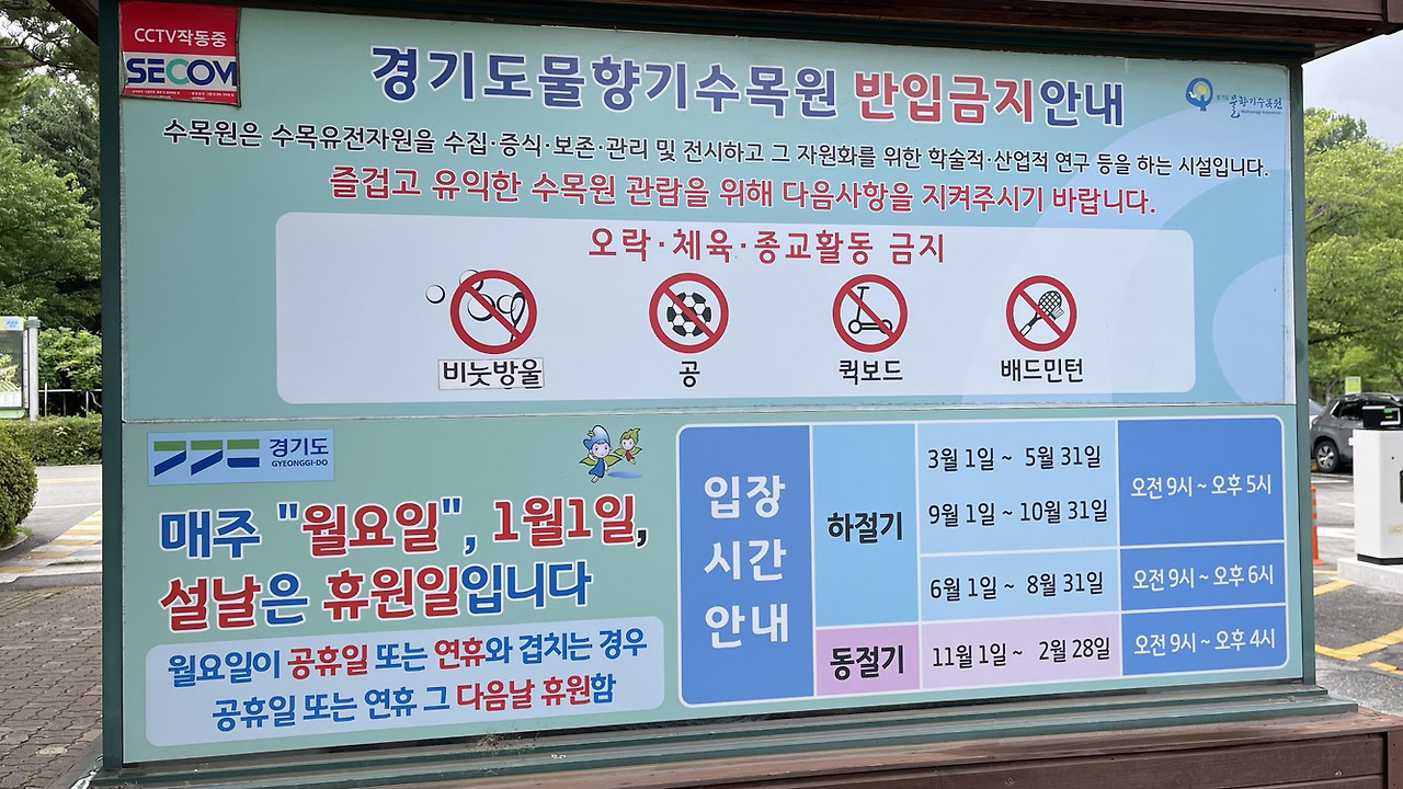 물향기수목원은 매주 월요일과 1월 1일, 설날에는 휴관합니다. 운영 시간은 계절에 따라 다르며, 봄과 가을에는 오전 9시부터 오후 5시까지, 여름에는 오후 6시까지, 겨울에는 오후 4시까지 운영됩니다. 방문 시에는 안내판을 참고하여, 금지된 활동을 피하고 자연을 보호하는 데 협조해 주시기 바랍니다.