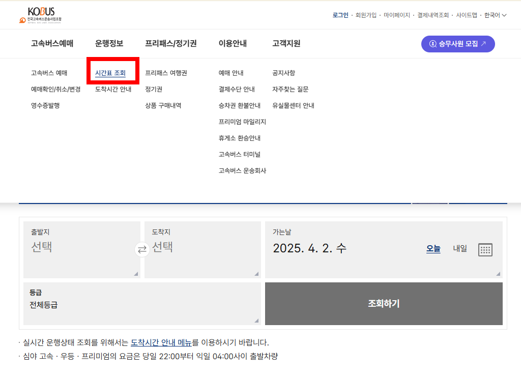 1️⃣ 위에 "고속버스 터미널 시간표 조회"를 클릭하여 홈페이지로 접속합니다.