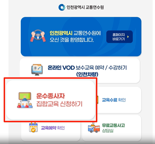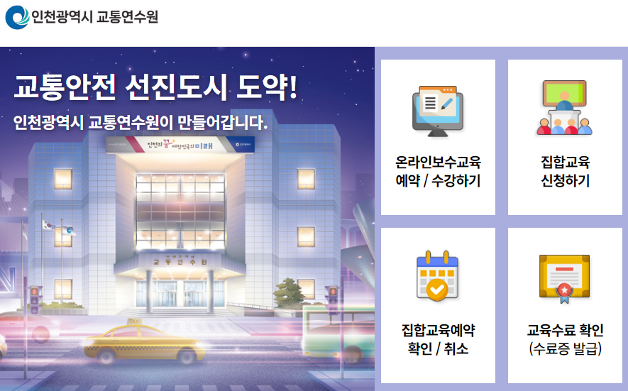집합합교육은 인천광역시 교통연수원에 직접 방문하여 교육을 듣는 방식이며 사전 예약으로 진행 됩니다. 아래 링크를 통해 간편하게 사전에 집합교육을 신청하세요.