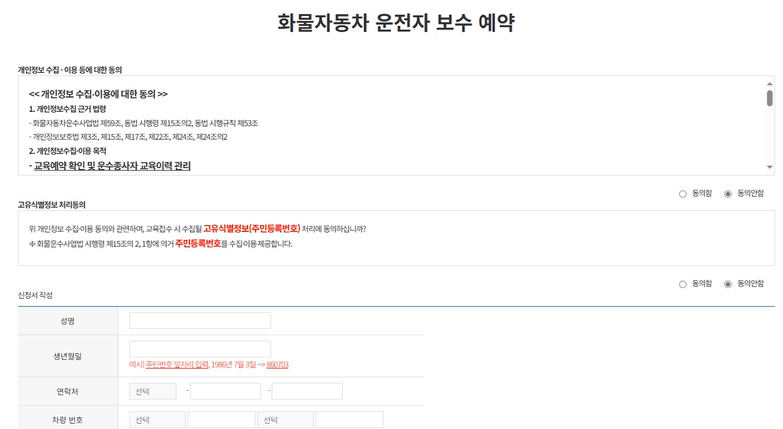 4. 화물자동차 운전자 보수 예약에서 '동의함'을 선택 하고 신청서를 작성합니다. 성명, 생년월일, 연락처, 차량번호, 차량등록지, 업종구분, 회사명을 정확하게 입력합니다.