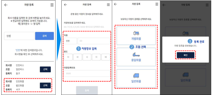 4. 법인화물인 경우 회사를 선택한 후 차량정보와 조합을 입력하고 차량 등록을 완료합니다.