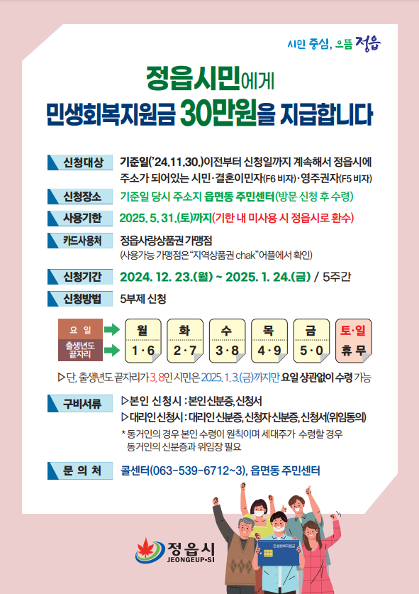 ❍ 신청대상 : ‘24.11.30.이전부터 정읍시에 계속해서 주소가 되어있는 시민, 영주권자, 결혼이민자