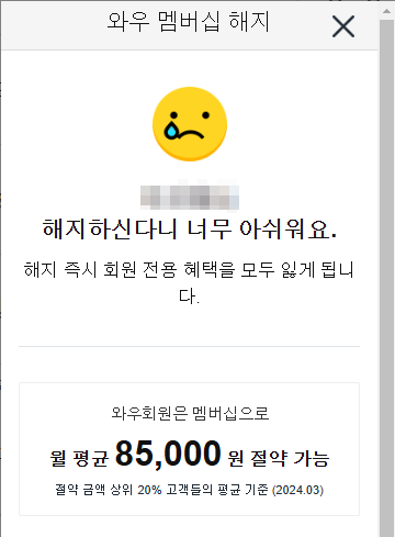와우 멤버십 관리 화면에서 절약한 금액을 살펴보고 화면 스크롤을 하단으로 이동합니다. 그리고 해지하기 버튼을 클릭하세요.