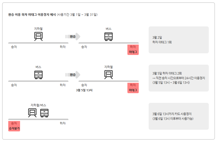 환승 이용 하차 미태그 이용정지 예시 (사용기간 3월 1일 ~ 3월 31일)