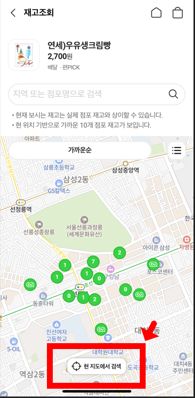 4) 그러면 현재 계신곳 위치를 기반으로 주변에 구매가 가능한 점포를 최대 10곳까지 보여줍니다.
